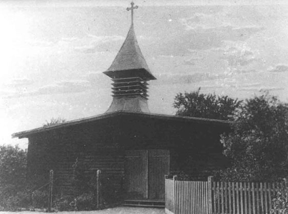 Über dem Windfang am Eingang dieser Barackenkirche stand das kleine hölzerne Türmchen, in dem nun die alte Glocke aus der Lagerkirche hing.