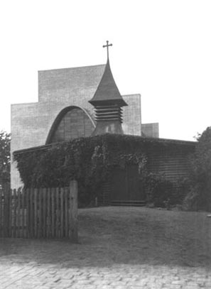 Der warme Ton des bodenständigen Ziegelmaterials gibt den Flächen reiches Leben, zumal im wechselnden reizvollen Spiel des Sonnenlichtes zu den verschiedenen Tageszeiten. Die durch Nischen aufgelockerten Seitenwände tragen das spitzbogenförmige Gewölbe im Lamellensystem, das wiederum durch die rautenförmige Anordnung der in Naturfarbe gehaltenen Stützen belebt ist.