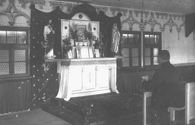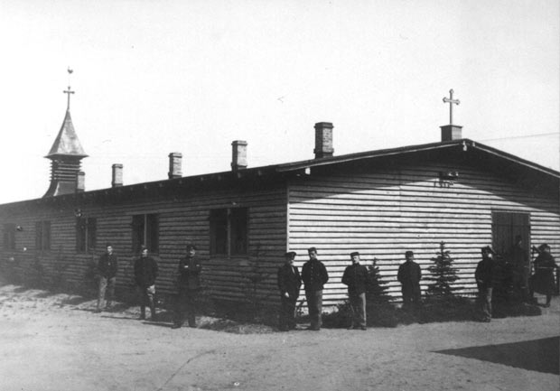 Im Gefangenenlager diente ihnen eine 20 x 10 m große Baracke als Kirche. Die Gefangenen bauten dann auf eigene Kosten auf der Baracke ein Türmchen, für das der Bonifatius-Verein eine Glocke leihweise zur Verfügung stellte (sie läutet noch bis 2014 bei uns zum Gottesdienst).
