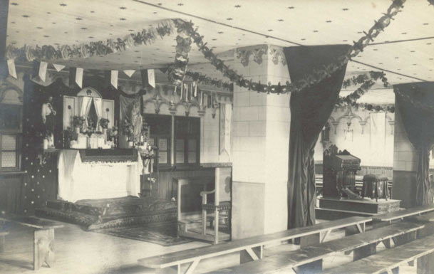 Unter der Leitung von Herrn Flügel und seiner Frau hatte die Gemeinde das Gotteshaus mit Lorbeerbäumen und Blumen geschmückt und der neue Pastor hielt dann sein erstes Hochamt bei uns.