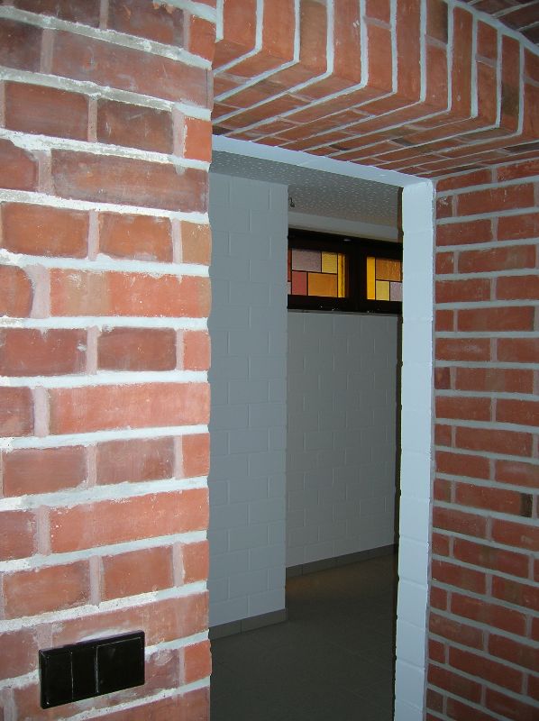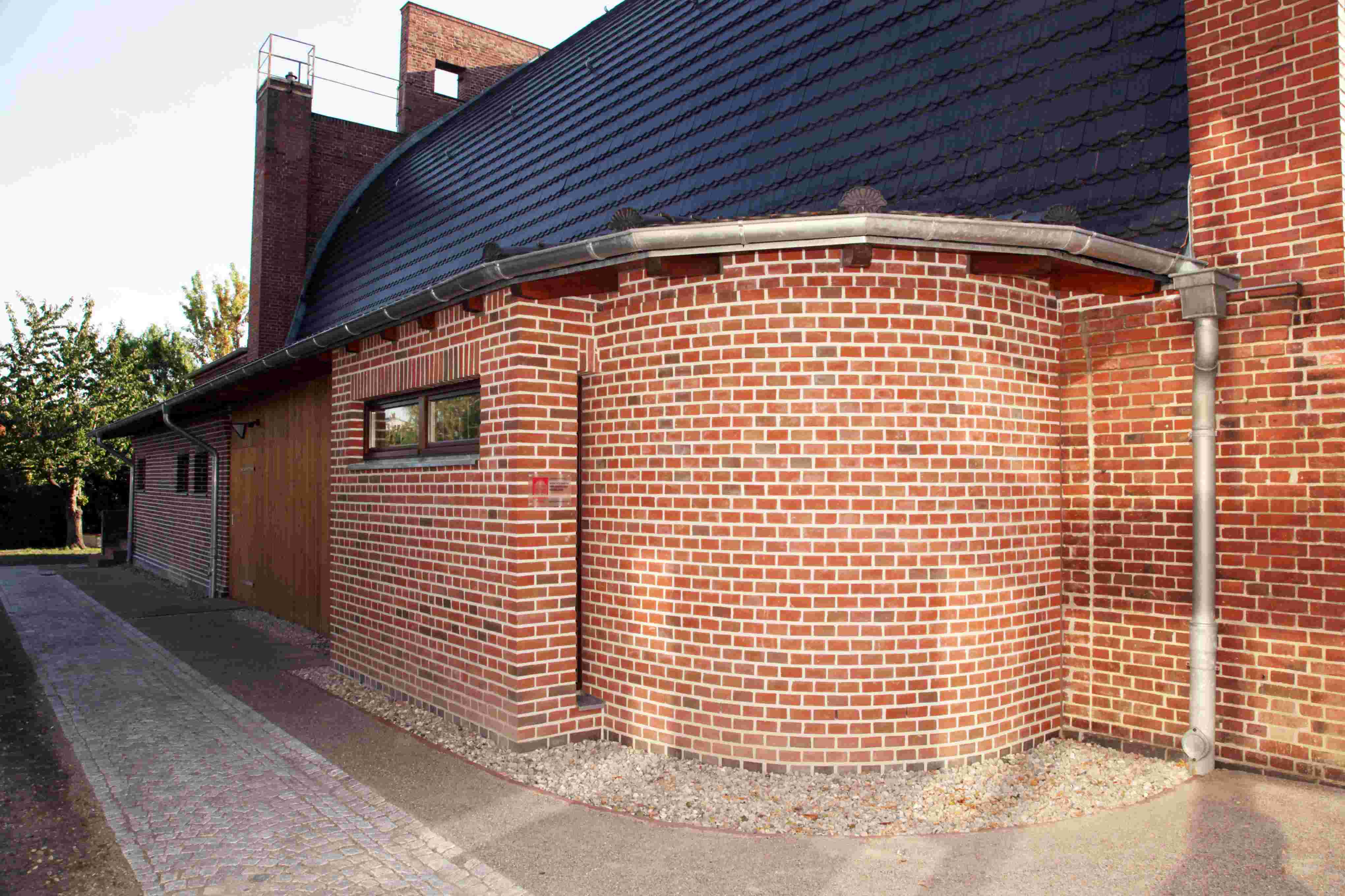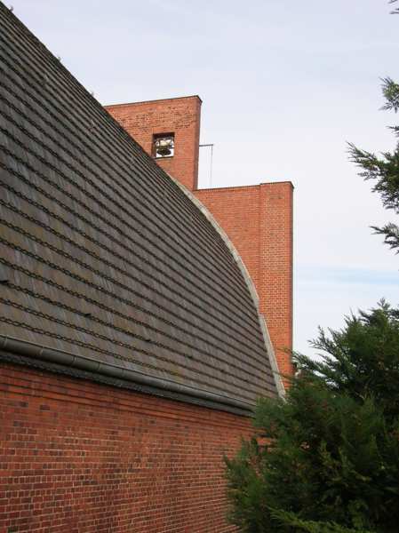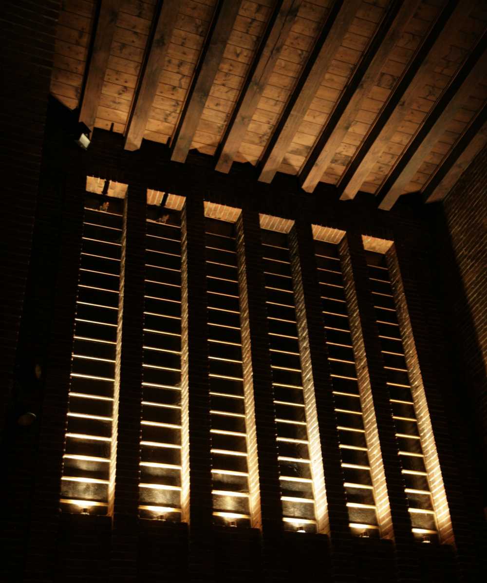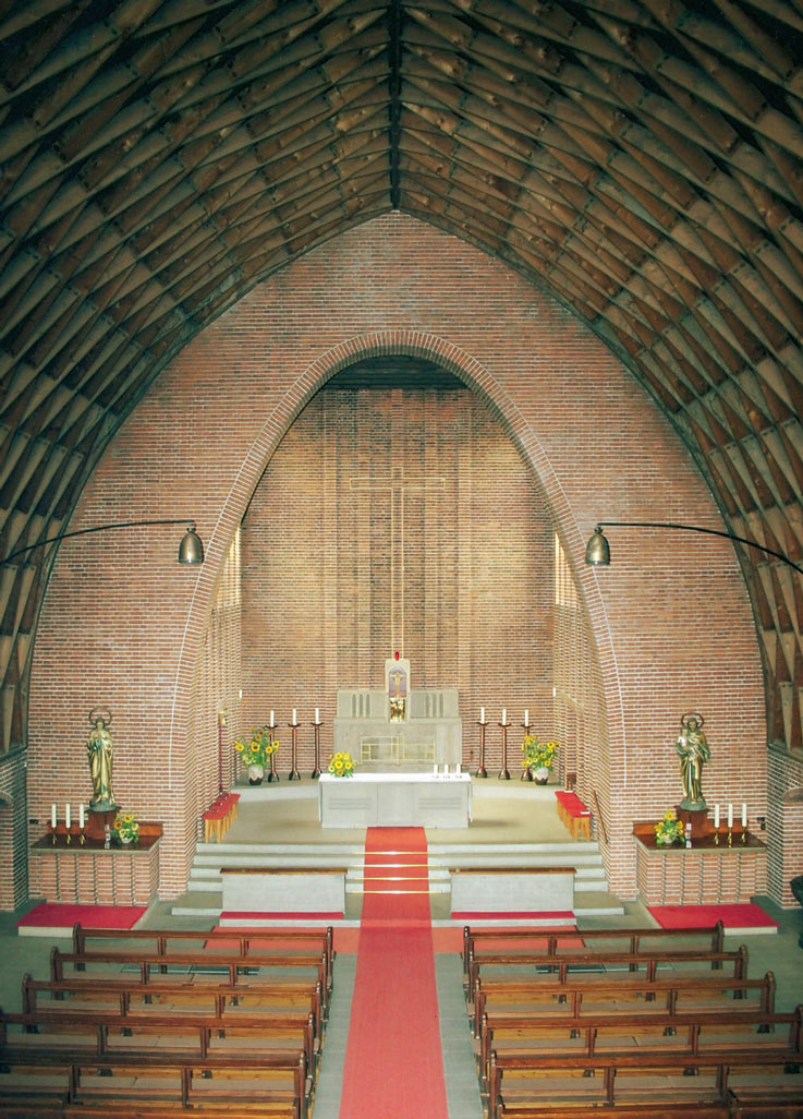 Der warme Ton des bodenständigen Ziegelmaterials gibt den Flächen reiches Leben, zumal im wechselnden reizvollen Spiel des Sonnenlichtes zu den verschiedenen Tageszeiten. Die durch Nischen aufgelockerten Seitenwände tragen das spitzbogenförmige Gewölbe im Lamellensystem, das wiederum durch die rautenförmige Anordnung der in Naturfarbe gehaltenen Stützen belebt ist.