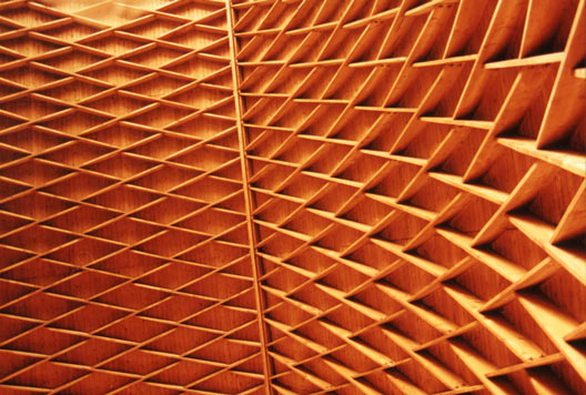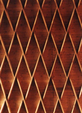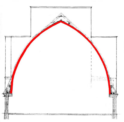 Das gewölbte Zollbau-Lamellendach wurde dann jedoch viel häufiger realisiert, indem die Längsseiten der Bretter gekrümmt zugeschnitten wurden und so die Wölbung des Daches bestimmten. Nach einer kurzen Erprobungsphase beschränkte man sich darauf, nur die nach oben zeigende Brettseite gebogen zuzuschneiden; die untere Seite blieb gerade. Die Bretter wurden rautenförmig aneinander gesetzt und verschraubt, so dass sich eine netzartige Dachfläche ergab - wie in unserer Kirche.