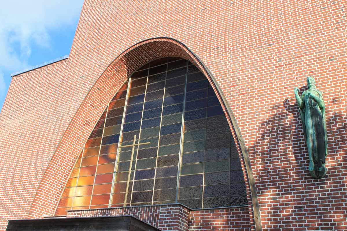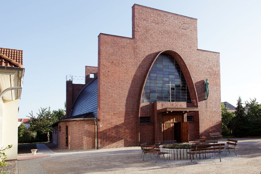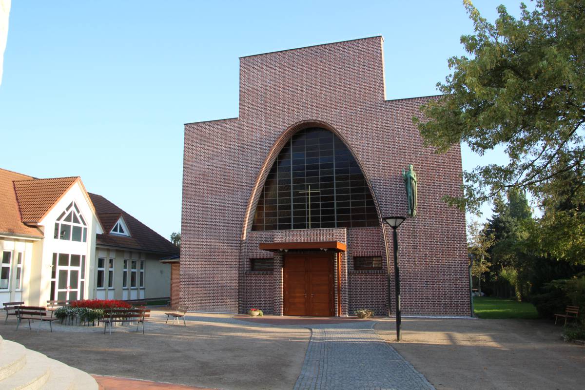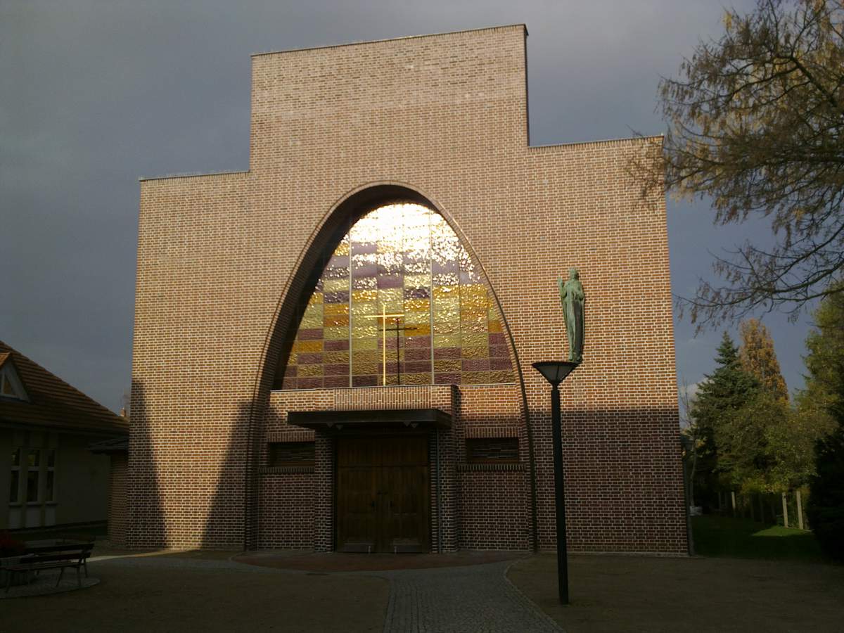 Der Besucher, der sich von der Grünen Straße aus über den Kirchplatz der Kirche nähert, schaut auf die stattliche Frontseite in heimischem Backstein. Neben dem mächtigen Fenster über dem Eingang ist auf der rechten Seite oben die Bronzeplastik der zum Himmel auffahrenden Gottesmutter Maria, der Patronin der Kirche, angebracht.