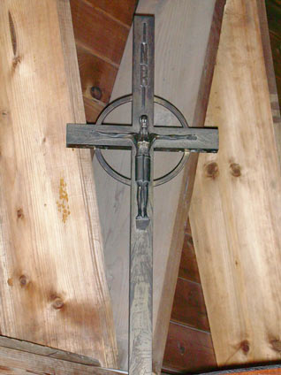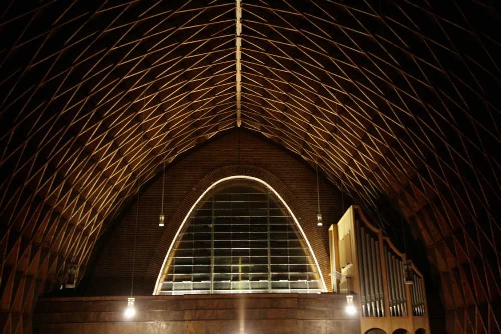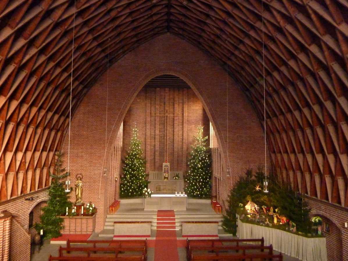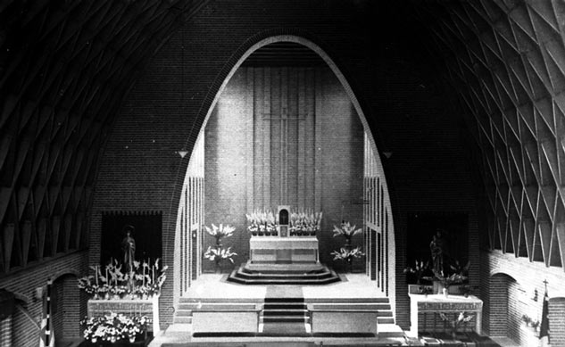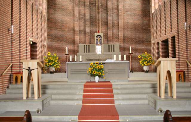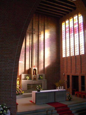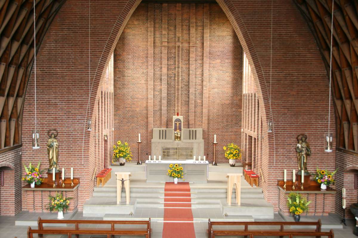 Ein starkes, großes Gewölbe und ein formvollendet aufsteigender hoher Bogen ziehen das Auge zum Chor und zu dem schlichten, nur in Umrißlinien angebrachten vergoldeten Kreuz auf der Stirnwand über dem Tabernakel.