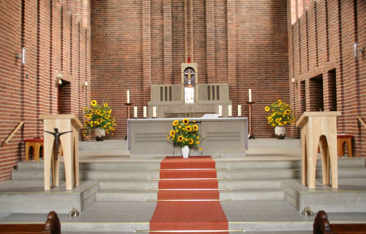 Die Ausstattung des Gotteshauses fügt sich schlicht in die Geschlossenheit der Räume ein. Der Hochaltar aus Kunststein ist in einfachsten Formen gehalten. Gemäß den Möglichkeiten und Forderungen der erneuerten Liturgie, die vom II. Vatikanischen Konzil eingeleitet wurde, ist die Altarmensa 1969 von ihrem erhöhten Stand an der Rückwand des Altarraumes nach vorne versetzt worden und erhielt ihre jetzige Form.