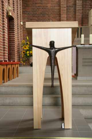 Das linke Ambo besitzt zusätzlich einen Bronzeguss einer von Hans Naczenski geschaffenen Figur des "Auferstandenen Christus".