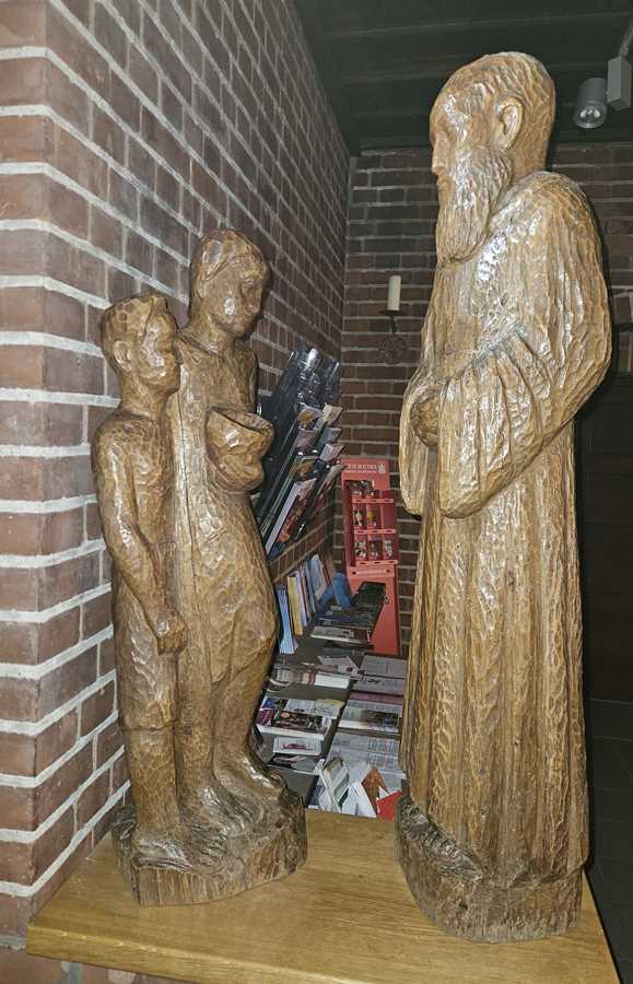 Als Werke moderner Holzschnitzkunst erhielt die Kirche später (zwischen 1946 und 1960) die unten im Eingang links stehende Plastik des Hl. Bruders Konrad von Parzham und das am rechten Pfeiler angebrachte Bild des Antonius von Padua, beides Werke des Berliner Professors Paul Dierkes (1907-1968), der ein enger Freund unseres damaligen Pfarrers, des Dechanten August Niemeyers war (Dierkes stammte wie Niemeyer aus Westfalen).