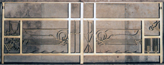 Es zeigt die bildhafte Darstellung des Altarsakramentes: eine Kornähre und Weinrebe, den Abendmahlskelch und die Hostie, sowie die Taube als Sinnbild des Heiligen Geistes. Zwei anbetende Engelsgestalten weisen zur Mitte, zum Christuszeichen hin. Das Gitter ist ein Werk des heimischen Kunstschmiedemeisters Friedrich Gielow, der auch die bleiverglasten Fenster mit Taufsymbolen der rechten Sakristei fertigte.