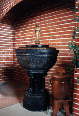 Aus einer anderen Stilepoche stammt der Taufstein aus belgischem Marmor mit dem kleinen holzgeschnitzten Bild Johannes des Täufers, ein Geschenk des Direktors Schulte-Peikum aus Essen zur Kirchweihe 1929. Das Johannes der Täufer oftmals ein Taufbecken ziert oder mit Wasser und Brunnen in Verbindung gebracht wird, beruht auf der großen Verehrung, die ihm vor allem am Johannestag (24. Juni) entgegengebracht wird. Jesus sagte einmal über ihn: " Unter den von der Frau Geborenen ist kein Größerer aufgestanden als Johannes der Täufer. " Auf diesem großen Wort beruht auch seine starke Verehrung.