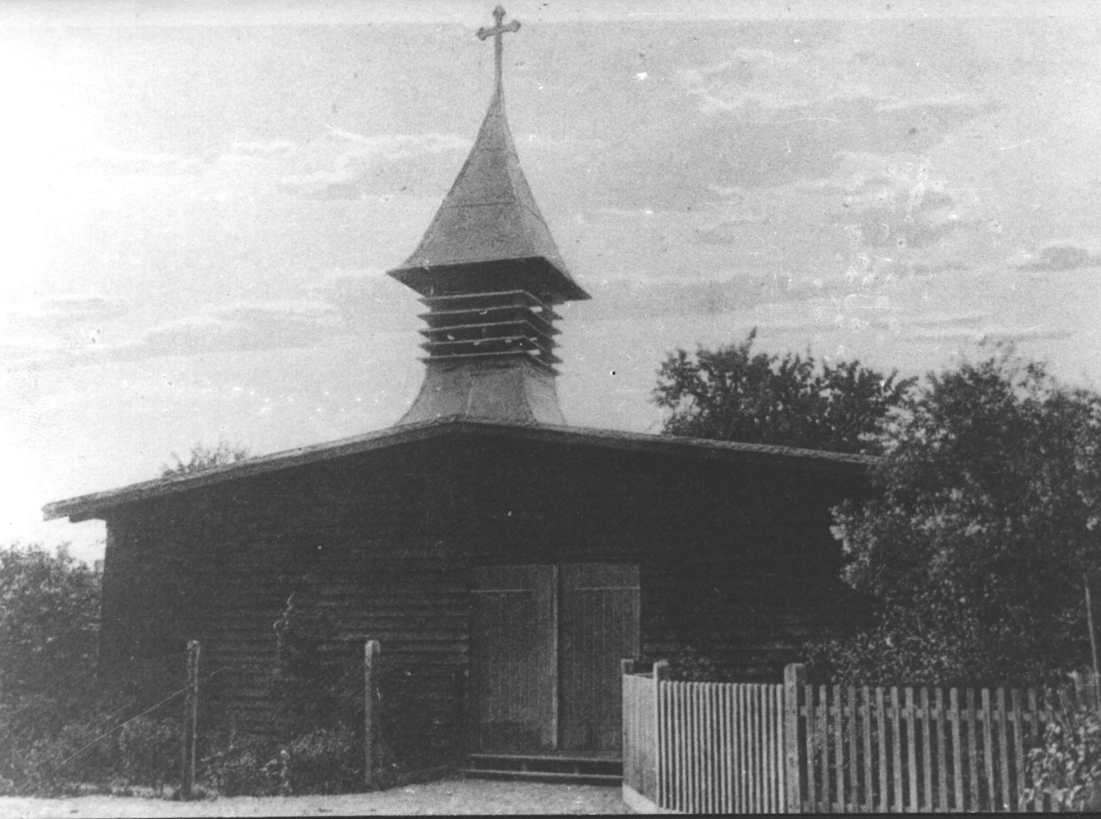 Über dem Windfang am Eingang dieser Barackenkirche stand das kleine hölzerne Türmchen, in dem nun die alte Glocke aus der Lagerkirche hing.