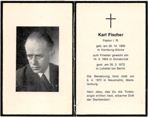 Karl Fischer verstarb am 28. März 1972, wurde nach Neustrelitz überführt und dort am 6. April " im Grab seiner Familie durch seinen früheren, von ihm 18 Jahre zuvor bei der SED-Kreisleitung Neustrelitz als "Staatsfeind" denunzierten Kaplan und nun agierenden Pfarrer Bernhard Kiepe beigesetzt.