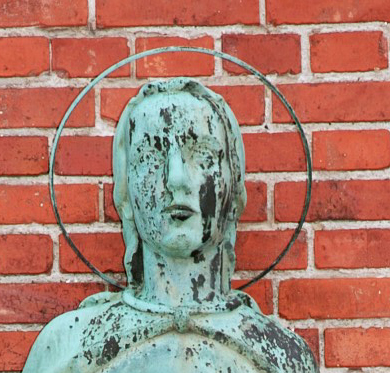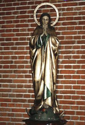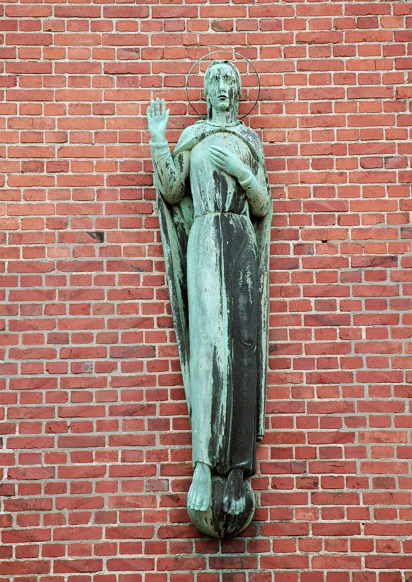 Die Bronzeplastik außen rechts an der Kirchenwand stellt die zum Himmel auffahrende Gottesmutter Maria dar. Sie wurde, ebenso wie auch das erste Gemeindehaus, von dem Güstrower Kaplan Bernhard Leffers, dem späteren Pastor von Warnemünde 1938 gestiftet und befindet sich erst seit dem 15. August 1938 an der Kirche.