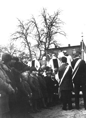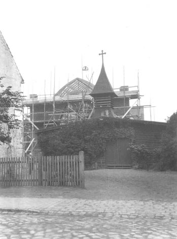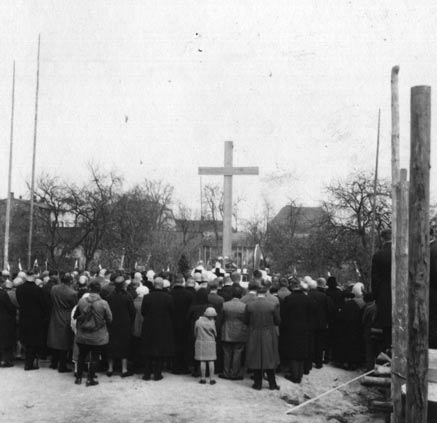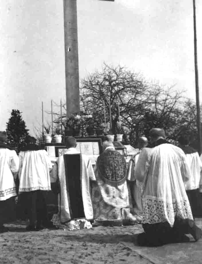 Ein mächtiges Kreuz aus schweren Bohlen gezimmert ragte an der Stelle empor, wo einmal der Altar stehen sollte. Zu Füßen des Kreuzes war ein provisorischer Altar errichtet, auf dem Pfarrer Brüx, der auch die Fest- predigt hielt, dann das erste Levitenamt in Güstrow unter Assistenz von Pfarrer Dorfmüller (Waren) und Kaplan Wippern (Güstrow) feierte.