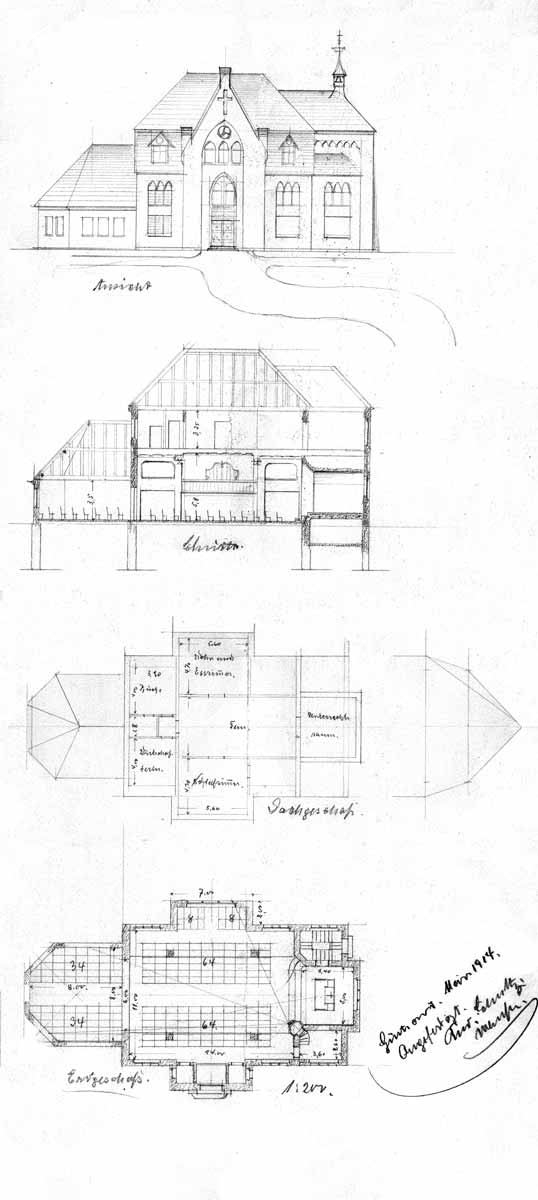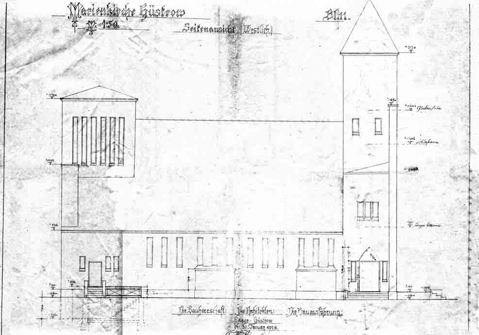 Bereits im März 1914 hatte der Maurermeister Rudolf Schultz eine erste Skizze für den Bau der neuen Kirche in Güstrow fertiggestellt, als der ausbrechende Krieg diese Pläne jedoch vereitelte.